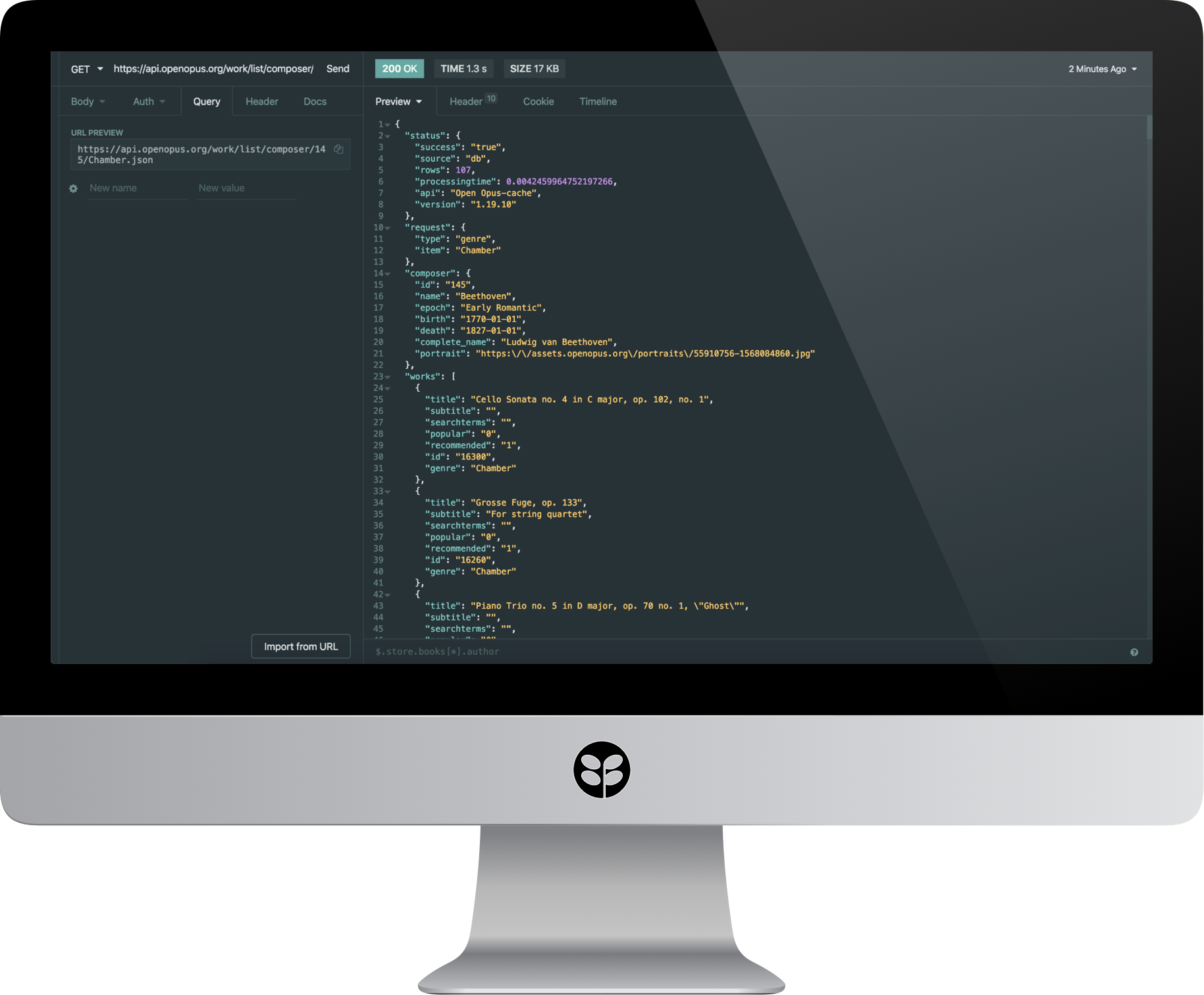 Music metadata is not a new thing, and there are truly incredible projects out there. But most music databases were created with pop music in mind and they aren't suited to classical music at all. Open Opus is a free, open sourced, collaborative database designed for classical music. 200+ composers and their complete works, fully categorized and easily available through a flexible web API. Music streaming, content, retail... if your app needs to deal with classical music, Open Opus can help you.